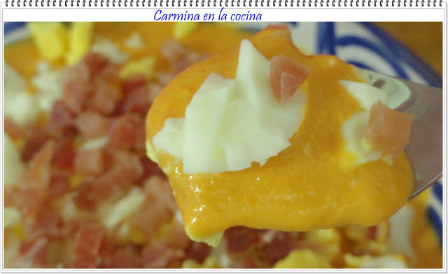 Cuando esté hecho el puré lo más fino posible ( si no tienes TMX, prueba a pasarlo por el chino), lo volcamos en cuencos y adornamos con jamón y huevo duro picados. ¡QUE APROVECHE!!