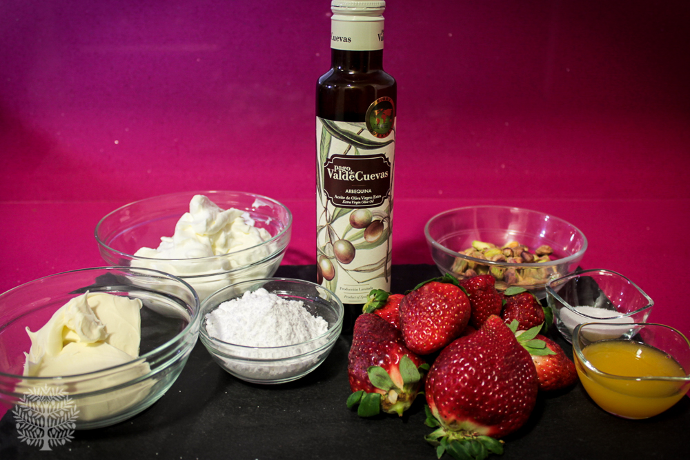 Tartar de fresas y pistachos con crema de queso y arbequino